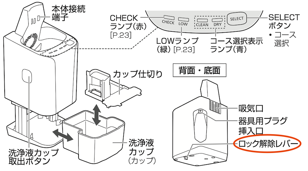 本日それが届き、洗浄液をセットするべく洗浄充電器側面の取出ボタンを押しても、洗浄器上部が持ち上がらず焦った。過去には無かった誤操作防止用ロック解除レバーが、いつの間にか底面に追加されていたのを知らんかった。
