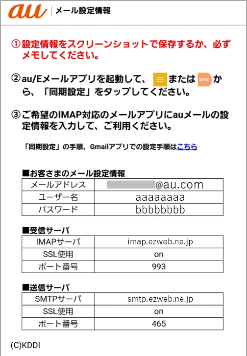 メール設定情報の入手方法は、auが案内する「その他のアプリにauメールを設定する」を参照。