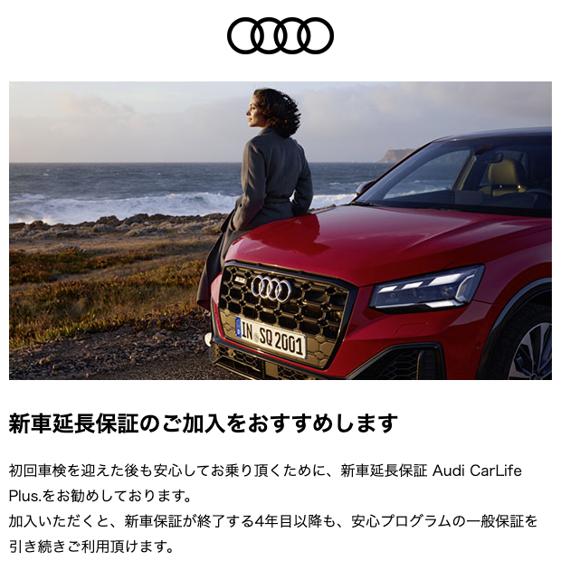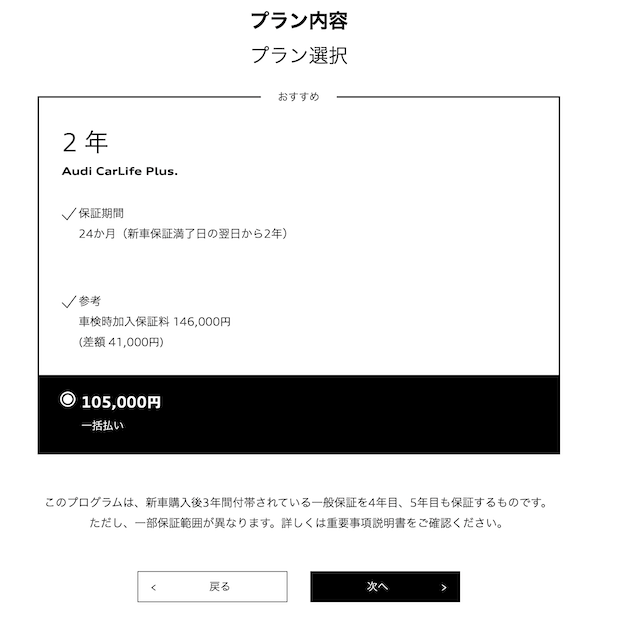 初回車検満了日の181日前までならば、2年分の保証料が28%(41,000円)も安くなるとのことなので、“新車延長保証 Audi CarLife Plus” を本日契約。