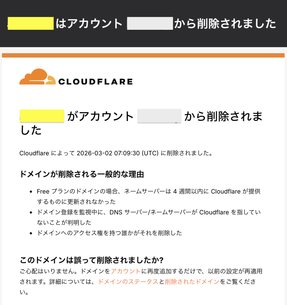 Cloudflareからの通告通りに1週間目の本日、無料でCDN利用のために登録していたドメインが、利用アカウントの管理対象ドメイン一覧から削除され、それを通知するメールも届いた。