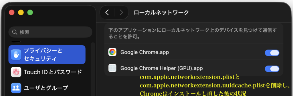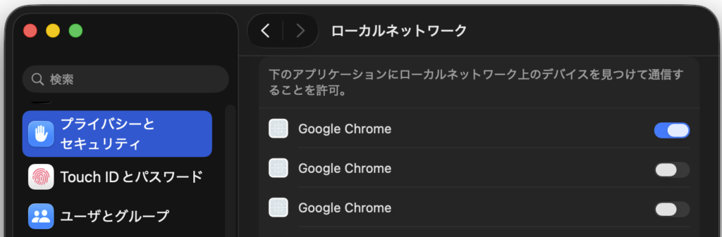 Mac上のSafariなら大丈夫だがChromeだと、LAN上のNASに接続不能となった。ローカルネットワーク許可設定を確認すると、なぜかChromeが複数存在する不穏な状態。