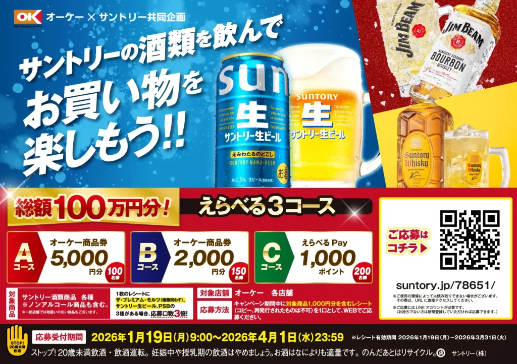 近所のOKストアに赴いたらば、「オーケー×サントリー共同企画 サントリーの酒類を飲んでお買い物を楽しもう」なるキャンペーンが開催中。本日支払ったビール代(約3万円)の元を取るべく、応募しておきました。
