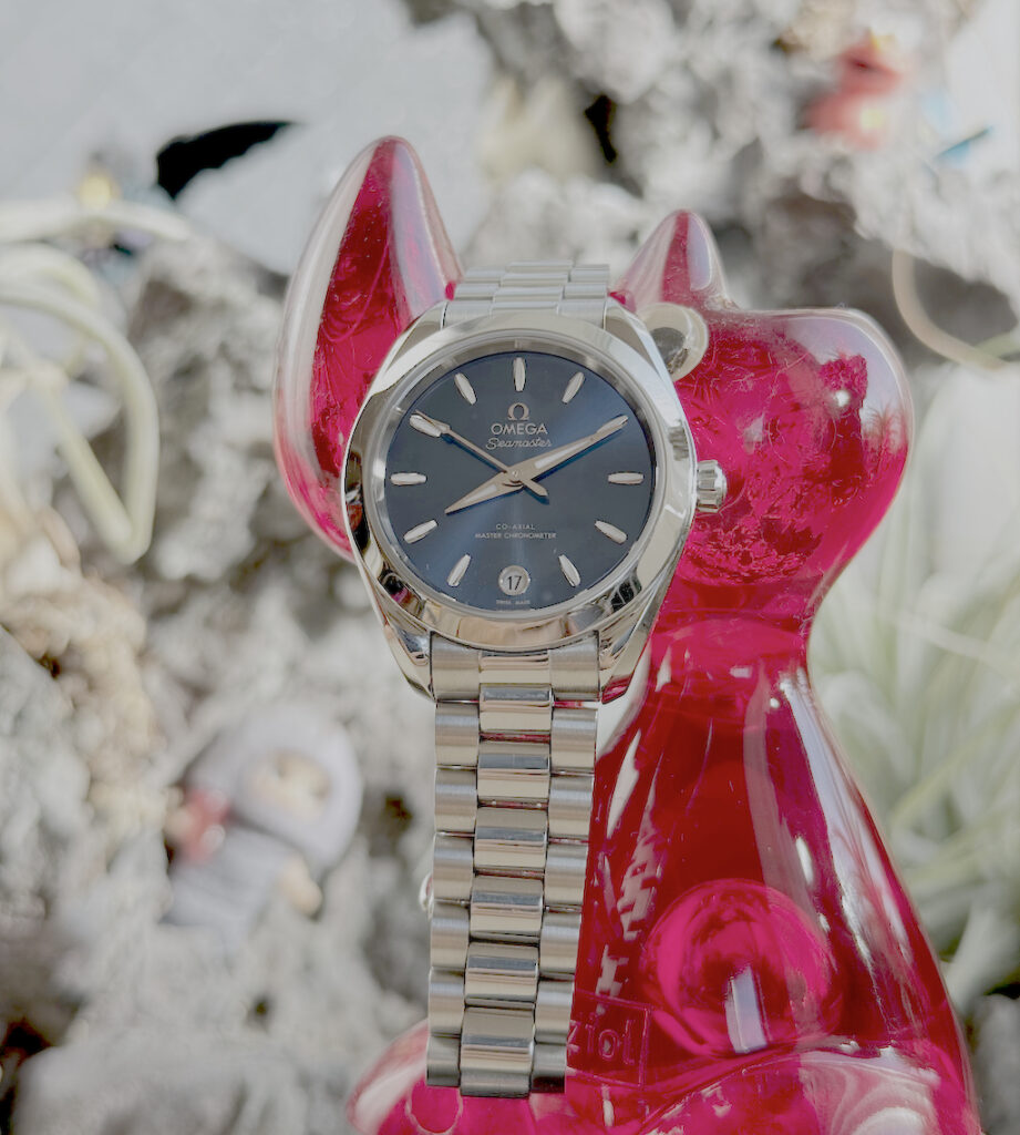 精度や耐磁に優れ、Apple Watchと併用なので目立たぬ小径サイズが良い。それを叶えてくれているのが、OMEGAアクアテラAqua Terra 30mm。