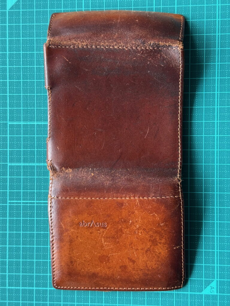 愛用のアブラサス abrAsus “薄い財布 buttero leather”(茶)は、8年間も使っていると革の傷みが目立ってました。