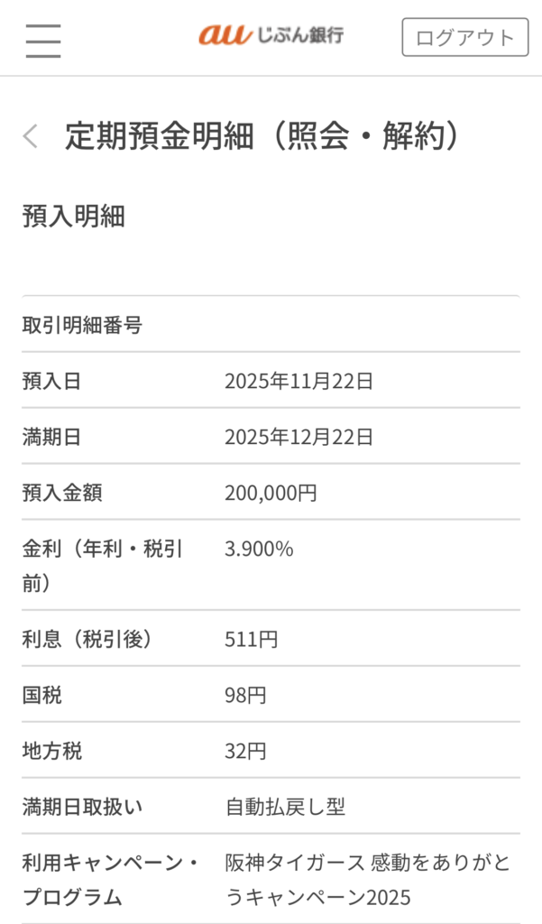 けど現時点では、他行の方が条件は良い。僅かな金額だけを同行に残す以外、大半を今日から始まったauじぶん銀行「冬の1年もの特別金利キャンペーン」(1年定期/年利1.25%)に預け替えの見込み。