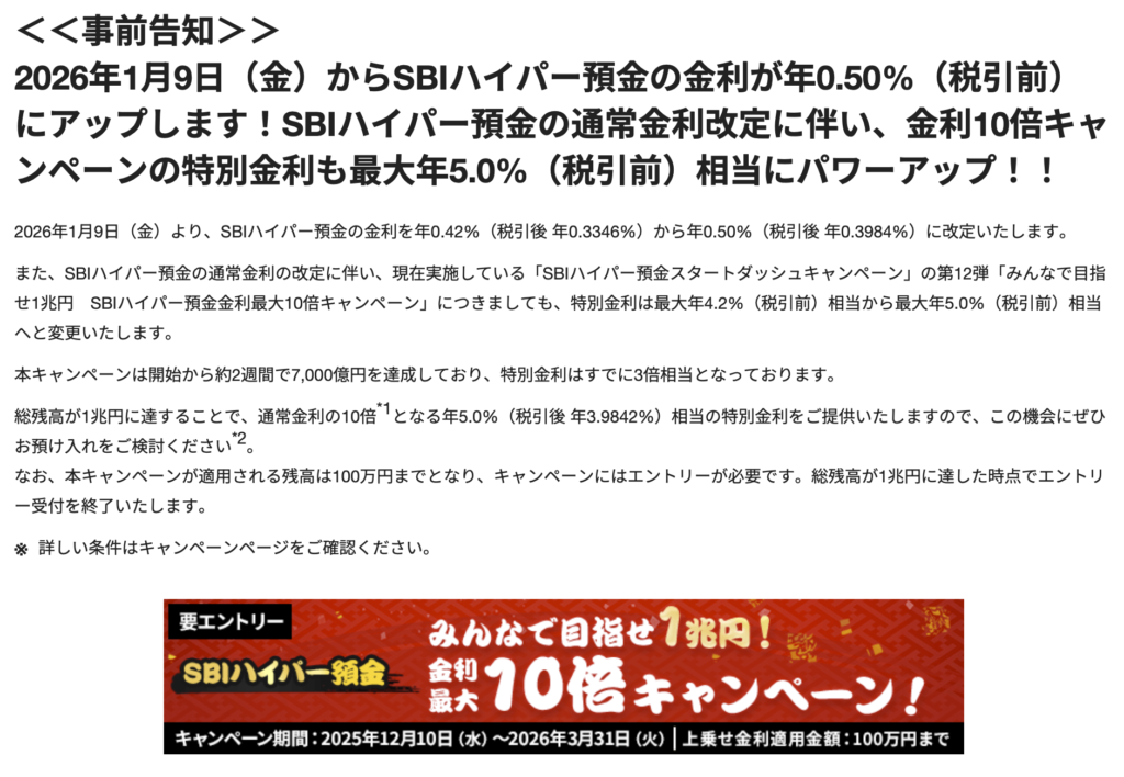 SBI新生銀行が、SBIハイパー預金の通常金利を年0.50%に上げると予告。けれど上乗せ金利の対象残高が百万円迄な点の変更が無い点は、とても残念です。