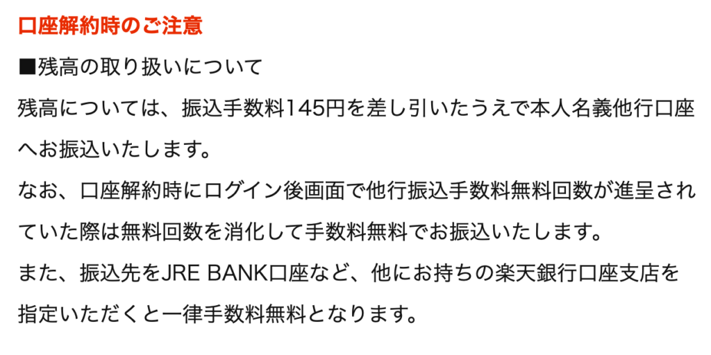 楽天銀行の口座解約案内によれば、残高は振込手数料145円を控除して、他行口座へ振込とのこと。
