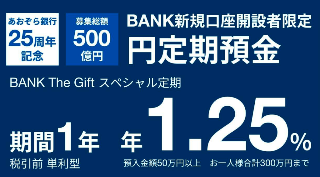 利用中の “あおぞら銀行” が、25周年記念で年利1.25%の1年物定期を募集とのこと。SBI新生銀行での定期預金が近日満期になるので、その預け替え先の選択肢になるかと思いました。