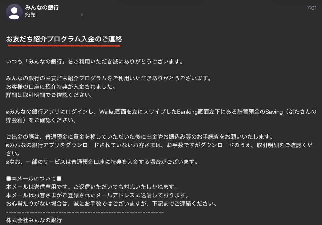 みんなの銀行から「お友だち紹介プログラム入金」との謎メールが届いて驚いた。新規口座を昨日開設した際、紹介制度は利用していない。