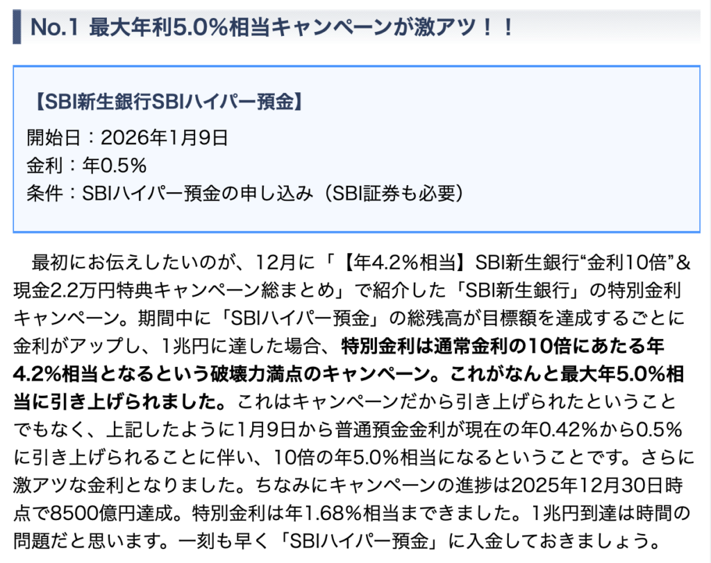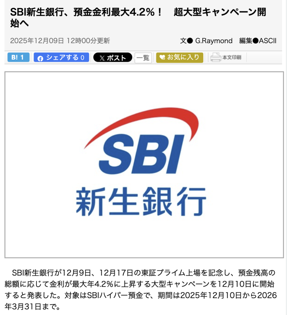 SBI新生銀行SBIハイパー預金の金利が上がる話は嬉しいです。けれどASCIIやそれを引用するRakuten Infoseek等のメディアによる、『預金金利最大4.2%!超大型キャンペーン開始へ』との記事題名には戸惑いを覚えます。