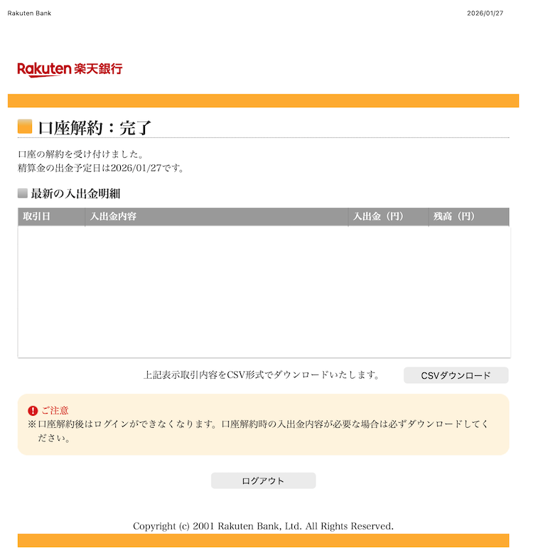 本日の楽天銀行の口座解約をもってして、楽天の金融サービス御三家(楽天カード、楽天銀行、楽天証券)との縁切り完了。
