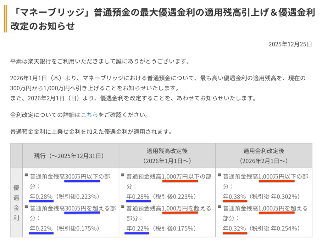 大晦日の本日、楽天銀行から適用優遇金利のお知らせメールが届いてた。同行の優遇金利は、来年2月以降にも改定予定なれど、今のご時世において他行に比べてショボ過ぎます。