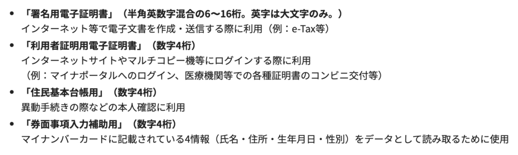 先日更新したマイナンバーカードでは、運転免許証、保険証、銀行手続き等で恩恵を覚える私でも、同カードに関して唯一不満なのが暗証番号等の呼称。添付画像のものが正式呼称とのこと。