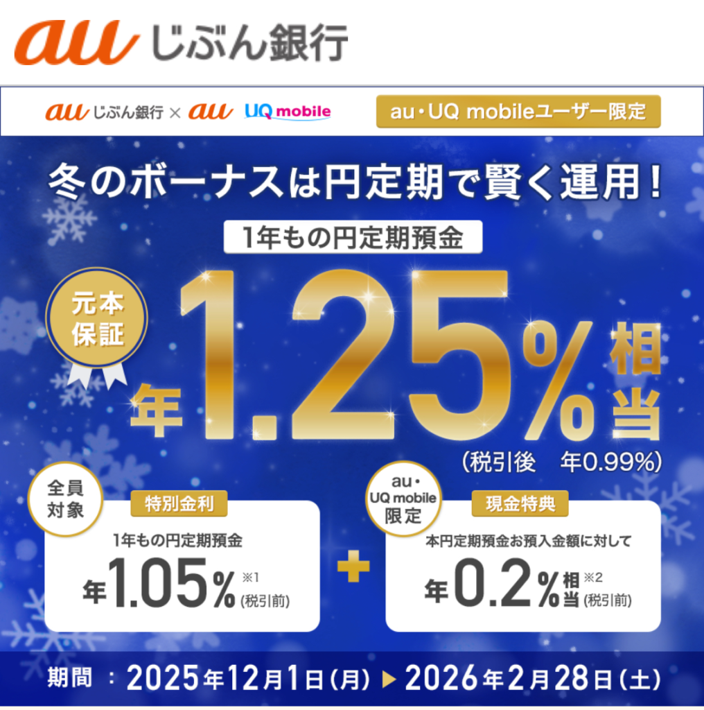 その大半をauじぶん銀行へ、全銀システム稼動時間拡大の恩恵で即時振込。これを年利1.25%の「冬の1年もの特別金利キャンペーン」へ入金。