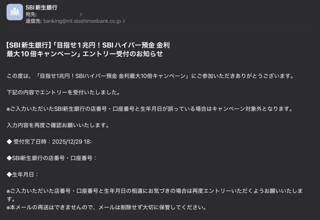 SBI新生銀行の「SBIハイパー預金 金利最大10倍キャンペーン」の特典には、キャンペーンにエントリーが必要。自身でも危うかったのは、SBIハイパー預金口座の開設にて、エントリーも済んだ気になっていたこと。先ほど念の為にとエントリーの操作をしたら、受付確認メールが “初めて” 届いてしまった。