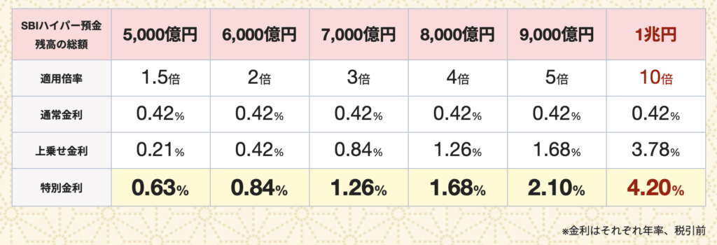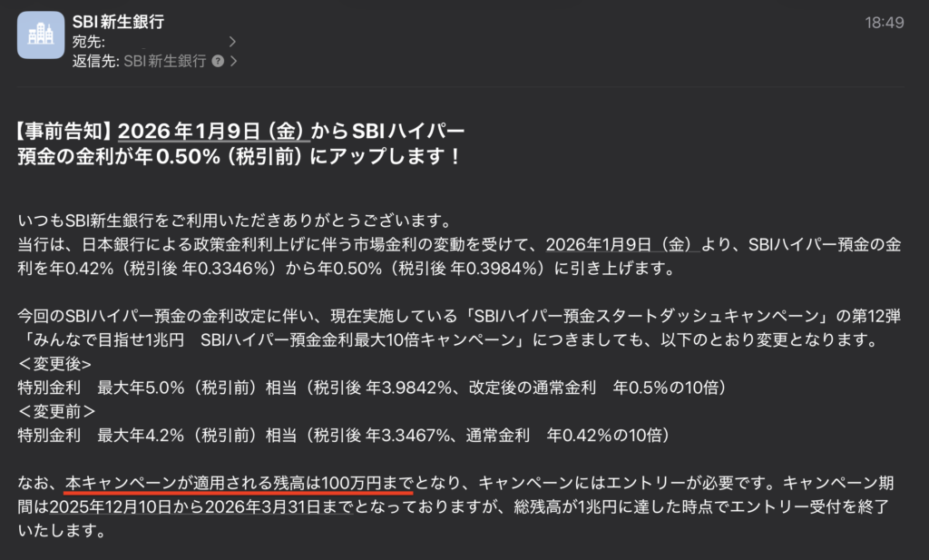 SBI新生銀行におけるSBIハイパー預金が所定の総残高になり、金利が年利0.5%を超えることになったならばその時点で、優遇金利適用上限の百万円だけを預け入れることにします。