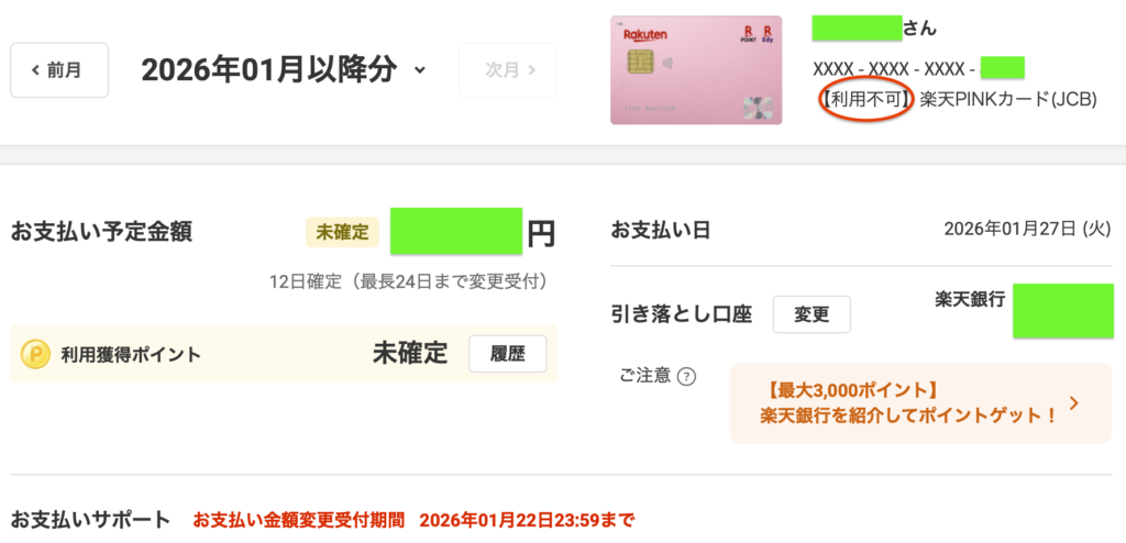 けれどカード利用が不可になっただけで、銀行口座決済が未完了のカード利用分は、即時処理とはならぬ模様。月末の引き落とし予定日迄待たねばならず、楽天銀行口座の解約も遠のいてしまい残念。