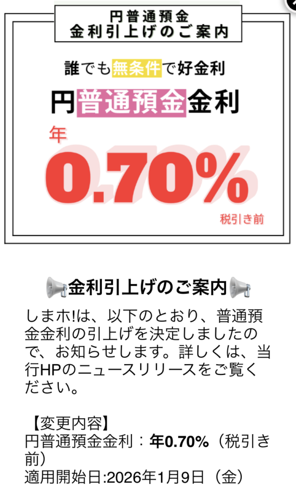 同行以外にも、金利が高いことで私も利用している銀行がいくつか有り、それらの動きが気になるところです。