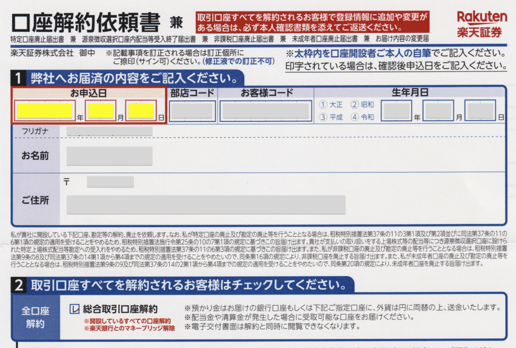 楽天銀行口座を近日解約するのに先立って、楽天証券口座を解約すべくネット上で申請したら、書面提出が必要とのこと。