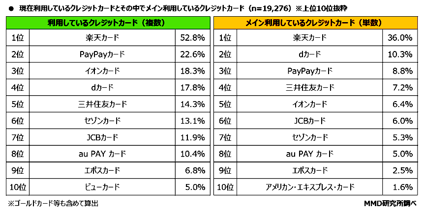 MMD研究所によるクレジットカード利用調査の1月22日付け記事では、“利用頻度が最も多い” のは楽天カードとのこと。