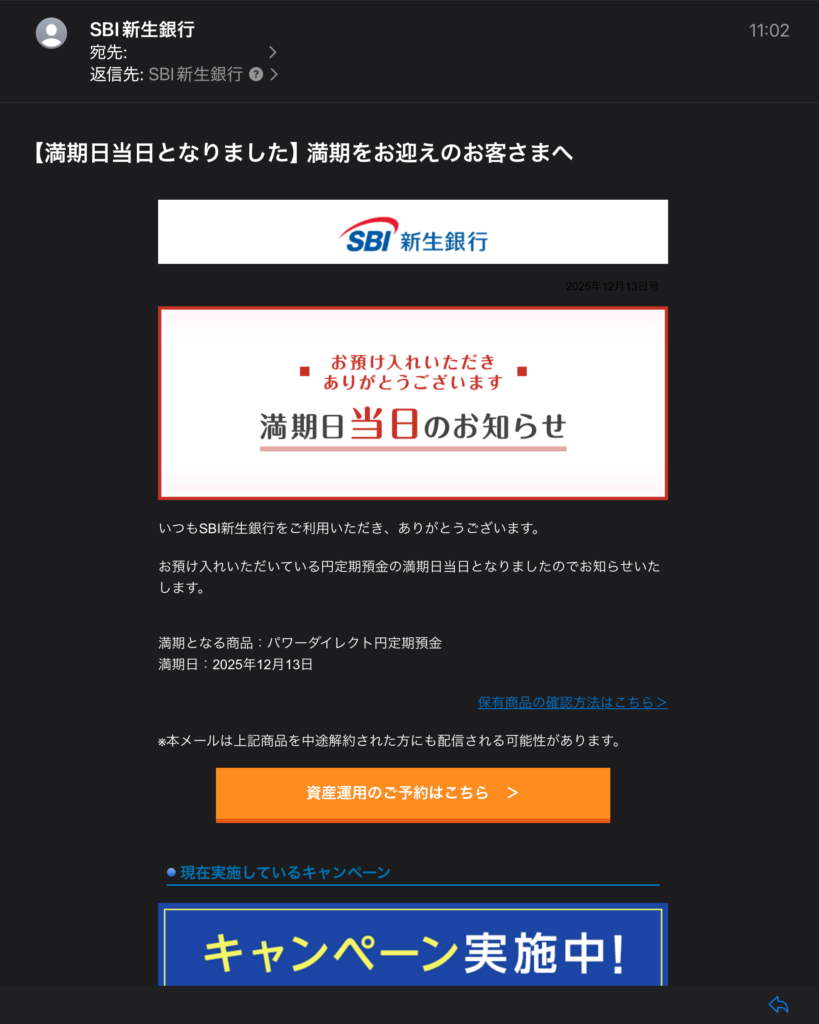 SBI新生銀行から本日午前11時過ぎに、定期預金満期を受けての資産運用勧誘メールが届いた。けれど、何を今更と言った感じです。
