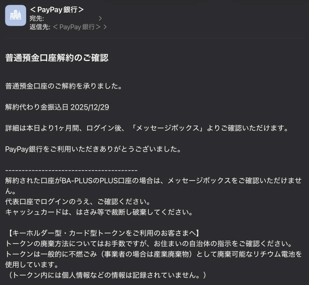PayPay銀行の口座解約で、auじぶん銀行への解約代わり金の振込を今朝確認。