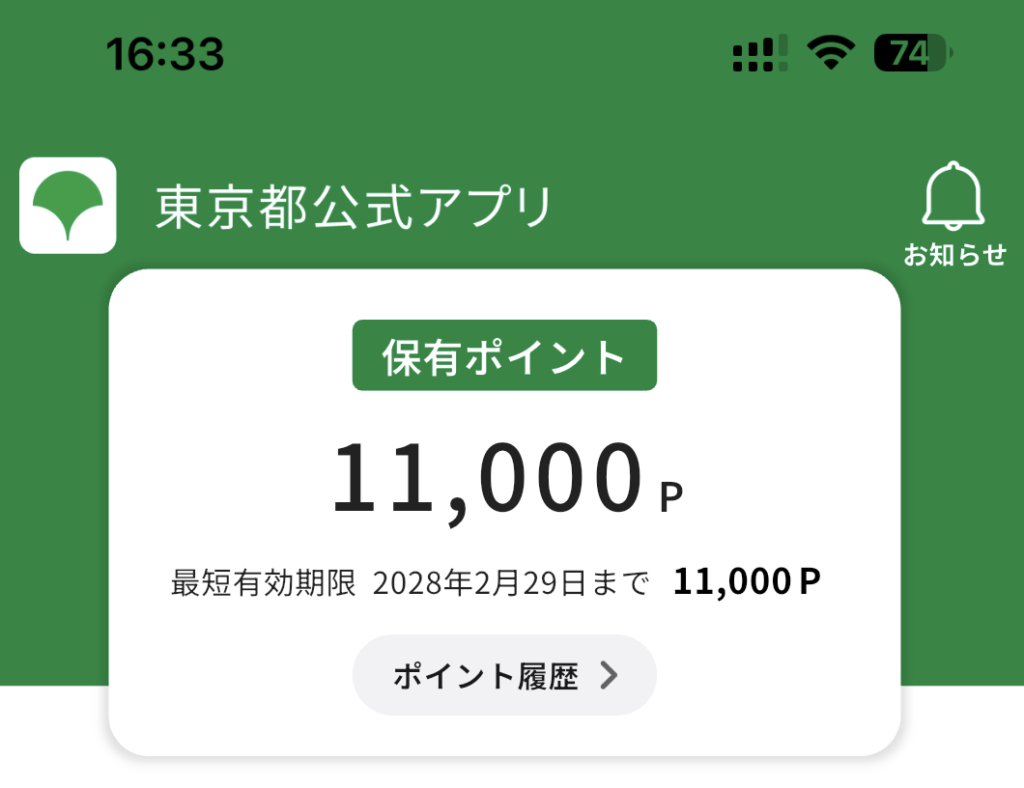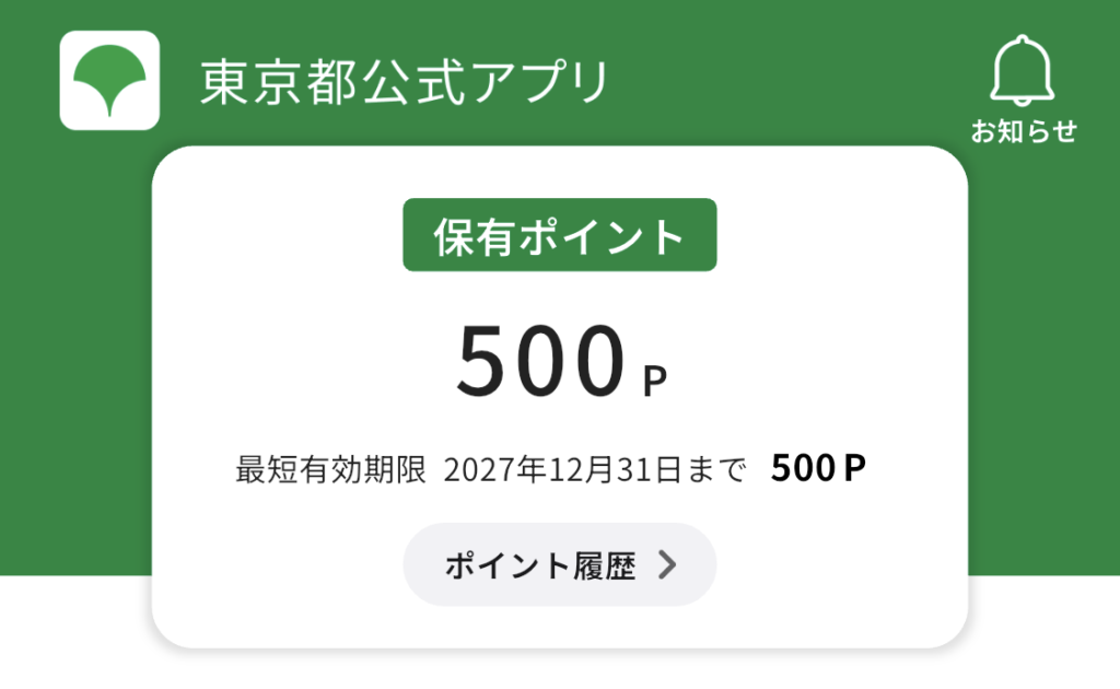 東京アプリの都民参加型最終検証に参加し、東京ポイント500円分が付与されてた。