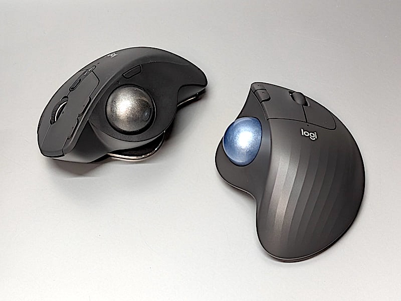 ロジクールのトラックボール MX ERGO MXTB1s(写真左) を、表面素材の加水分解劣化には妥協しつつ、使い続けて8年間。最近は、範囲選択が意図せず解除されてしまう不具合が起き始めた。