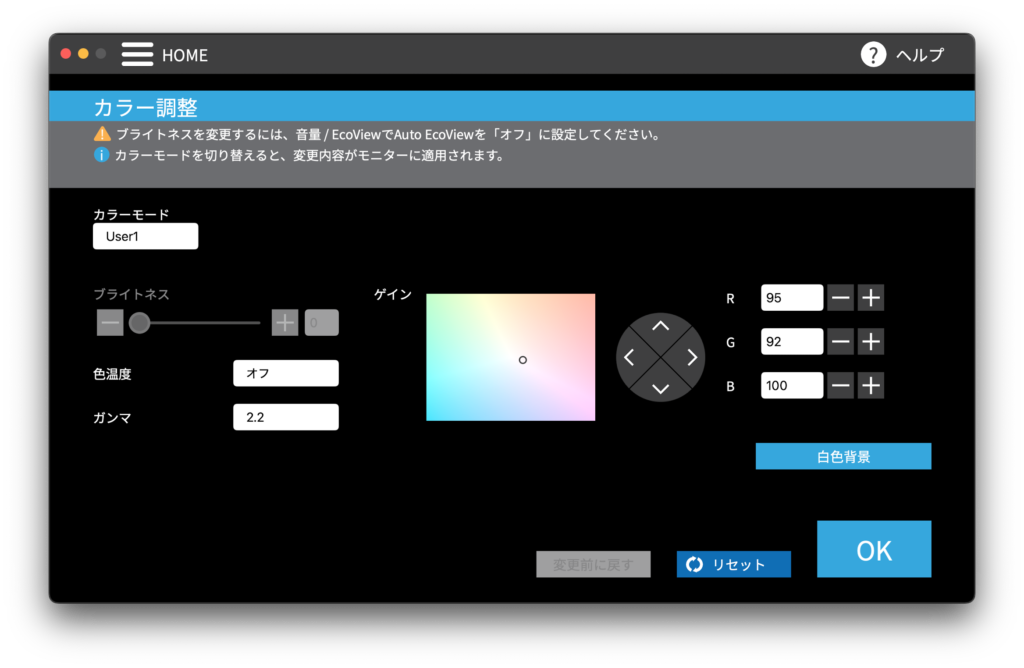 けれどEV2740SとEV2785の新体制では、Screen InStyleアプリの恩恵を受けられます。“白色背景” を表示させ、ポインタ操作で白色点を動かすだけで済むのは簡単でとても便利。