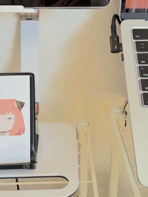 Macbook AirをPCスタンドに載せて絶好調。けれど電源&全信号伝達用Thunderboltケーブルの配線が、空中に突き出た形となるのは、意図せぬ接触による信号瞬断が懸念される。