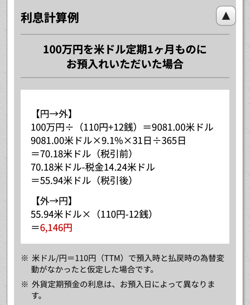 呆れたのは、示された利息計算例。為替相場の仲値(TTM)は、今日の時点の実情が157円ほどだと言うのに、それを110円で計算するって…勧誘に応じて預け入れをした場合の危うさを示しているとしか思えない。