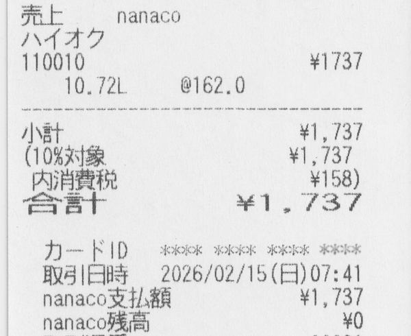 宿題その1:来月解約見込みのnanacoの残高を、ガソリンスタンドでの給油で使い切った。