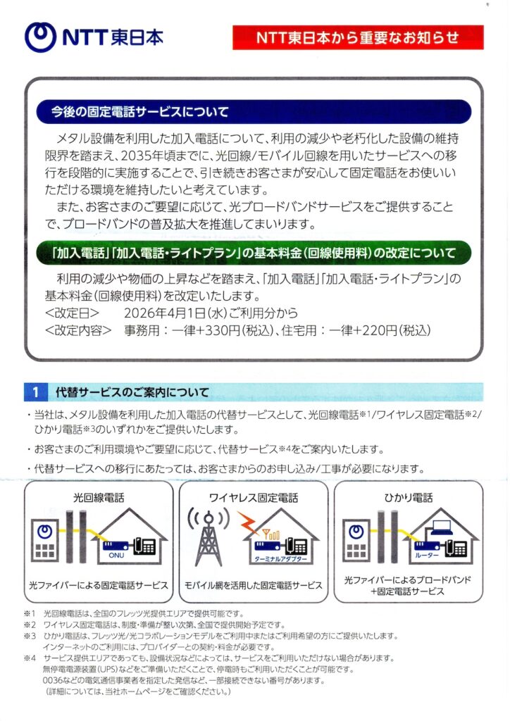 「今後の固定電話サービスについて」なる便りが、NTTより本日届く。要は、来年4月1日以降値上げとのこと。Nuro光電話も利用中の今、本件NTT電話は今後の有用性が見出せず、これを機会に本日付で解約を申請。