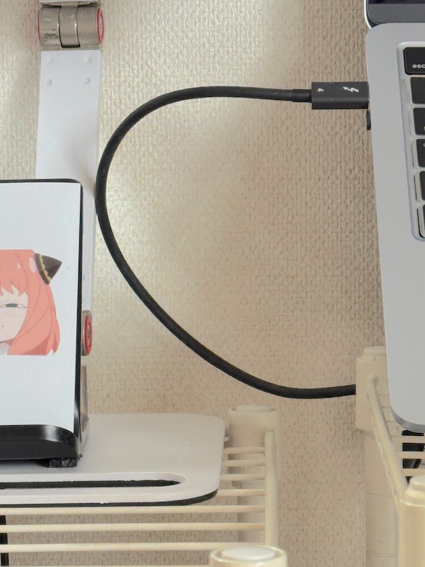 そこで、コネクタ部がL字型のThunderbolt 4 ケーブル(安さに魅かれamazonでchiatepの約2千円品)を導入してスッキリひと安心。