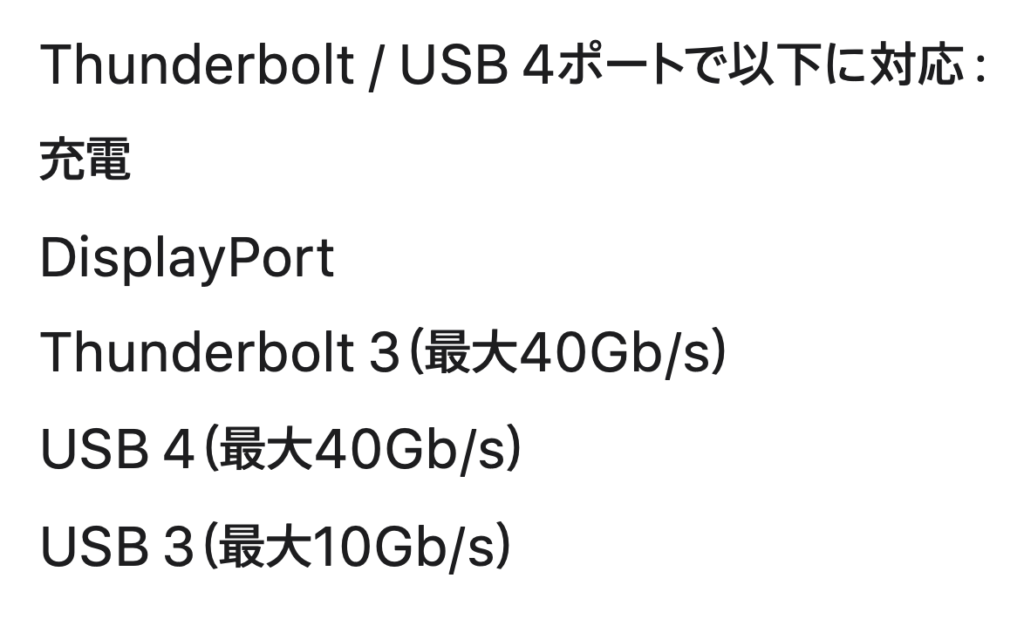 最初見たときは、Thunderbolt4/USB4 では冗長だから、そのような表記なのかと間違えました。けれどその表記が意味するのは、技術仕様にも記載のごとく、Thunderbolt4ではなくて Thunderbolt3とのこと。