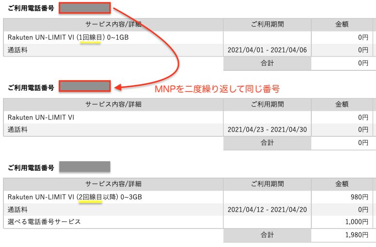 回線数の判定基準は月単位なので、添付画像3番目の回線契約が、利用期日は重ならずとも、2回線目とカウントされるのは納得できる話。MNPを二度繰り返して楽天に出戻りした添付画像2番目が、3回線目とは判定されず、無料なのは何より。