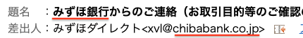 差出人メールアドレスは偽装可能なので真偽の参考にならぬとは言え、“みずほ銀行” を自称しているくせに、差出人には “千葉銀行” のアドレス。