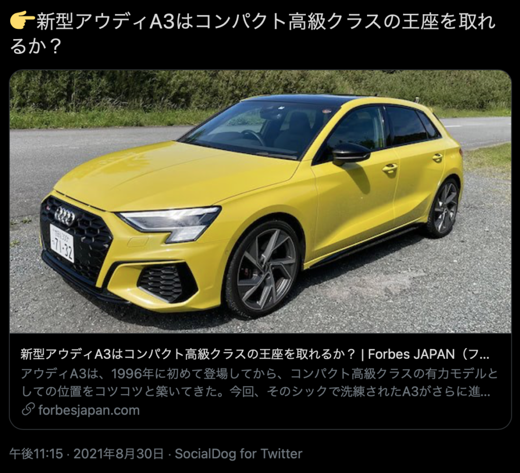 記事内容の信憑性を損ねるので、Forbes Japanの編集者は Audi の “A3” と “S3” とを間違えないでいただきたい。8/29 15:00時点では、“S3” の写真を “A3” であるとして掲載されています。