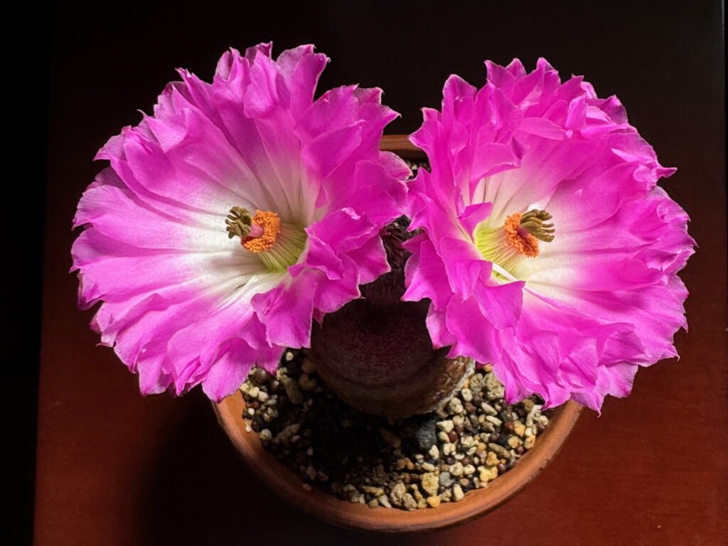 まだ6月中旬なのに梅雨前線がどこかへ行ってしまい、厳しい暑さが連日続く中、手元にある三鉢のサボテン “紫太陽 Echinocereus rigidissimus ssp. rubispinus” の内、二つが相前後して開花。