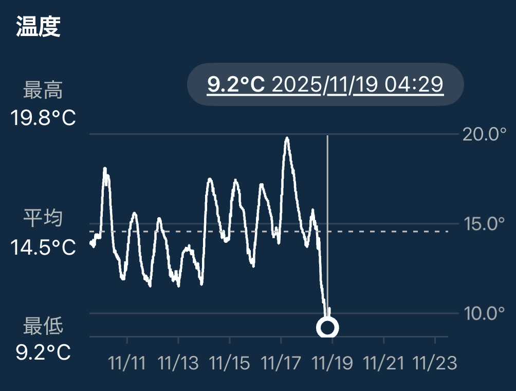 今朝は一段と冷え込み、玄関外に設置しているSwitchBot温度計の記録も、この冬で初めて10℃を下回った。けれど屋内では、まだ暖房未使用の寝室でも、20℃を下回らない。これは建物が、昼間の日差しで暖められ、その余熱があるおかげかな。