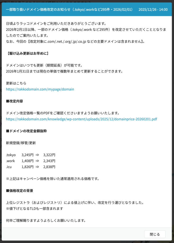 新gTLDで構成のドメインを一つ、Xserverからラッコドメインに移管した。ラッコは、ドメイン更新料が来月値上げになるけど、現行料金ならXserverより年間3千円ほど安くなるのです(Cloudflareよりも安い)。