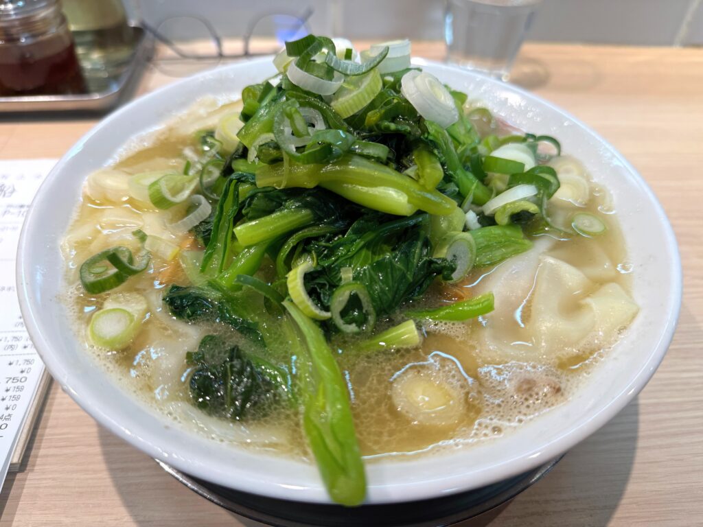 桜上水 船越での今年4杯目は、予告通りに塩味系。塩チャーシューメン・ハーフ(麺半分→青菜)+皮ワンタン5枚+ごはん 1750円。