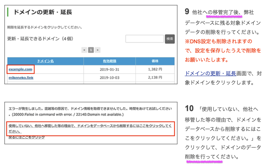 同社マニュアルによると、ドメインを管理対象から外すには、利用者自身で移管後に操作要とのこと。